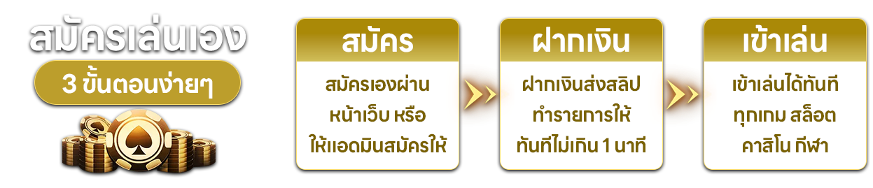 ตอบ : เข้าเว็บไซต์ กดปุ่มสมัครสมาชิก กรอกข้อมูลส่วนตัวให้ครบถ้วน ยืนยันเบอร์โทรศัพท์ รับ Username/Password เริ่มเล่นได้ทันที