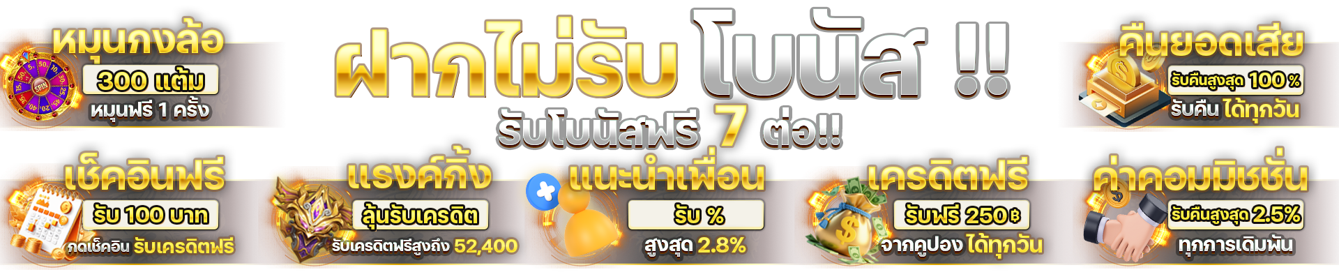 ตอบ : โบนัสต้อนรับ 100% แจกเครดิตฟรี คืนยอดเสีย โบนัสวันเกิด แนะนำเพื่อน สะสมแต้มแลกรางวัล และกิจกรรมพิเศษอื่นๆ อีกมากมาย